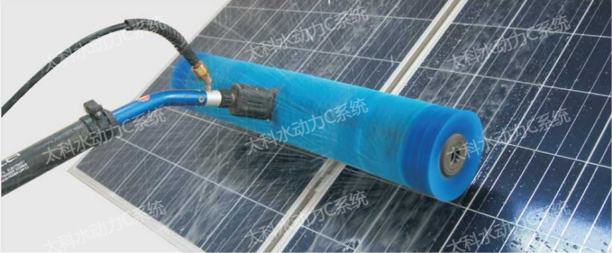 清洗系統(tǒng)由超高壓水驅(qū)動(dòng)刷子轉(zhuǎn)動(dòng)清洗,每小時(shí)可清洗500-1000平方米電池板。100-160bar高壓水流驅(qū)動(dòng)刷子,轉(zhuǎn)速700轉(zhuǎn)/分鐘,耗水5升/分鐘。刷子長(zhǎng)度有42公分、62公分、82公分、102公分,在100-160bar水壓驅(qū)動(dòng)下僅給電池板接觸面帶來(lái)3.5公斤的軌道壓力。