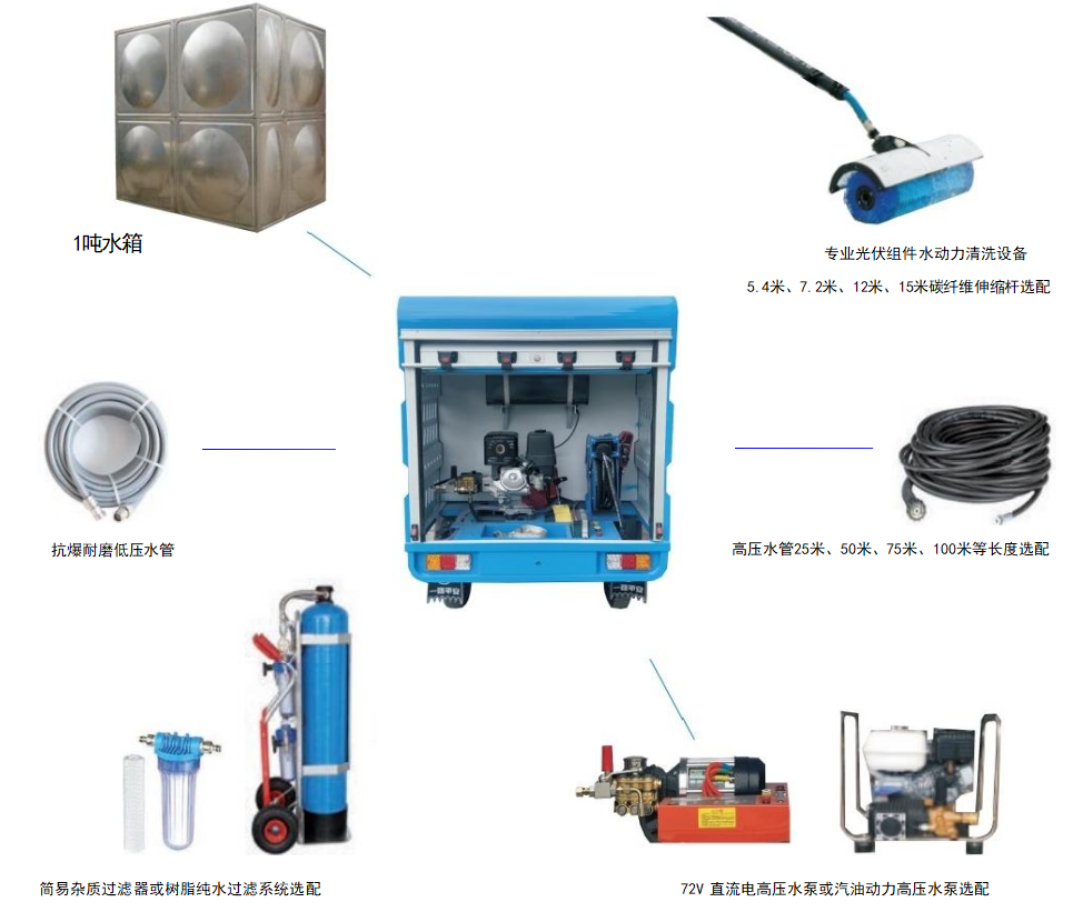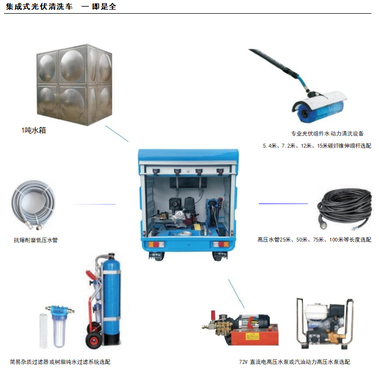 特推出了集成式光伏清洗車,用以整合光伏清洗設備所制定的方案。